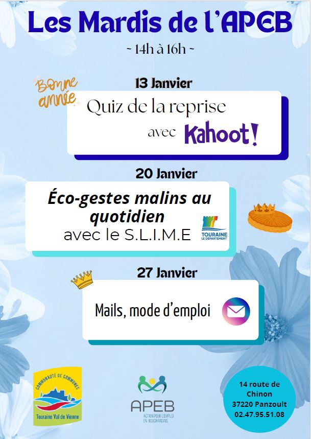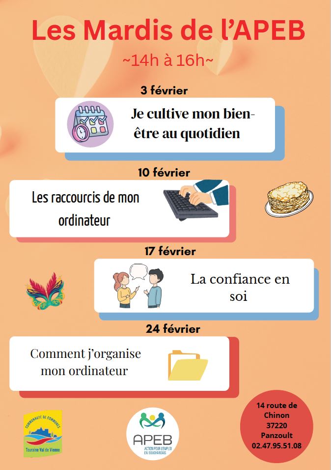 - Chaque mois, elle propose des actions collectives sur des thématiques précises afin de former et d’accompagner les personnes en recherche d’emploi. Elle a vocation à leur permettre d’améliorer leurs compétences individuelles et professionnelles. Elle dispose pour cela d’un personnel formé, de locaux adaptés et d’un espace numérique moderne (ordinateurs, tablettes…) qui lui vaut d’être labelisée « Espace Publique Numérique». Il faut savoir que les bénéficiaires du Revenu de Solidarité Active (RSA) sont suivis par les conseillères de l’APEB.